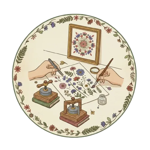 Pressed flower flatlay demonstrating preservation quality. Individual elements maintain form while integrated into overall composition.